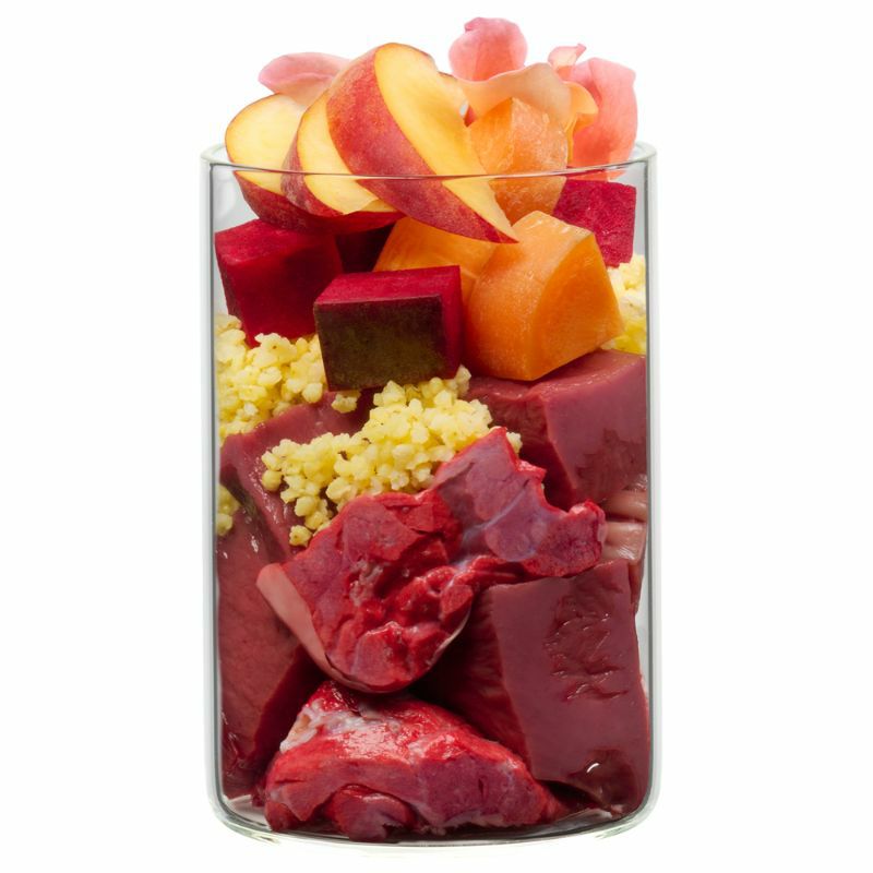 ラムの心臓 (51%)、ラムの肺 (9%)、キビ (8%)、人参、じゃがいも、レッドビート (5%)、リンゴ、パセリの根、桃 (1.6%)、ココナッツ粉 (1.6%)、レープシードオイル、パセリ*、ビール酵母、ローズヒップ* (0.2%)、セージ*、バラの花びら* (0.2%)、バジル*,オイスターシェル、ミネラルクレイ、ミネラル類 *乾燥