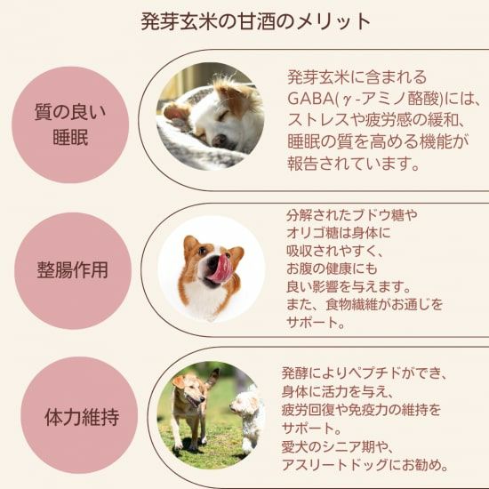 この甘酒にはアルコールが含まれないので、わんちゃんも安心してお召し上がりいただけます。