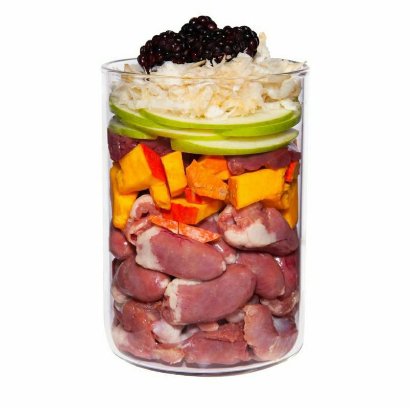 鶏の胃袋(28%)、鶏の心臓(19%)、カボチャ、鶏のレバー(8%)、リンゴ、パースニップ*(6%)、鶏の赤身肉(5%)、鶏の皮(3%)、ブラックベリー(3%)、ココナッツ粉、レープシードオイル、カボチャ種子粉、オイスターシェル*、ビール酵母、オオバコ*、カモミール*、ローズヒップ*、ダンデライオン*(0,2%)、ミネラルクレイ、アンデス塩、海藻*、ミネラル類、ビタミンD3・ビタミンE・銅・ヨウ素・亜鉛