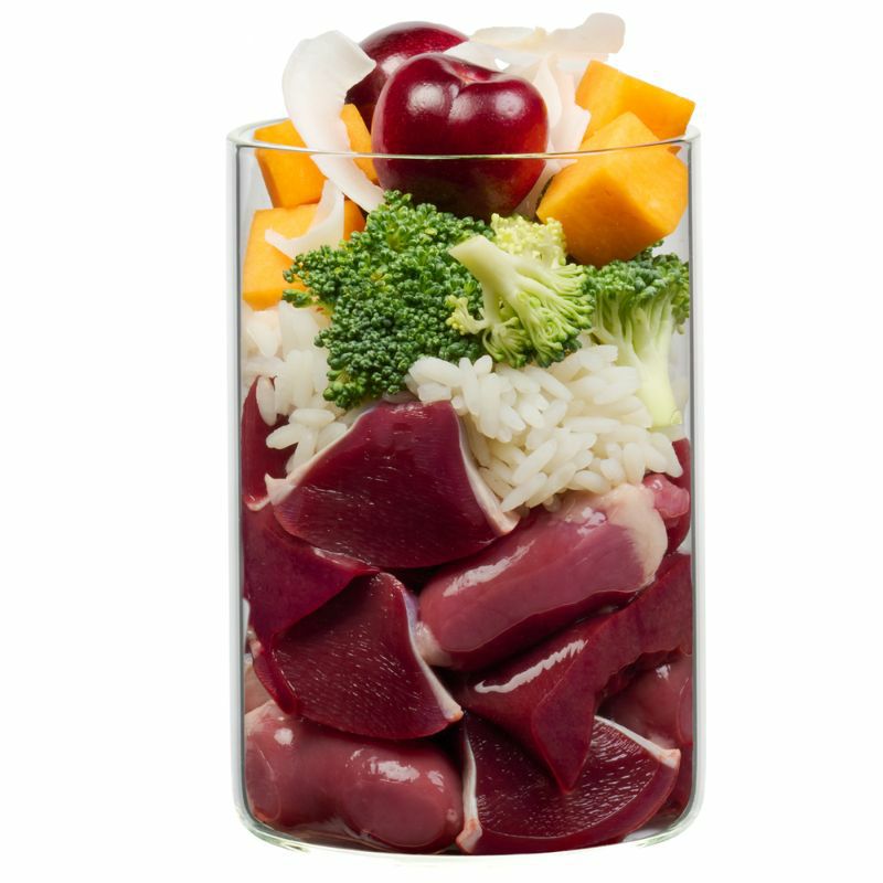 鶏の心臓 (31%)、鶏の胃袋 (13%)、人参、鶏のレバー (8%)、鶏の皮 (8%)、米 (8%)、ブロッコリー、パンプキン、キュウリ,桃、チェリーピューレ(0.8%)、ココナッツ粉 、レープシードオイル 、オイスターシェル、ビール酵母、セサミシード (0.2%)、コリアンダー* (0.2)、タイム*、チャービル*、イチョウの葉*、ミネラルクレイ、ミネラル類 *乾燥