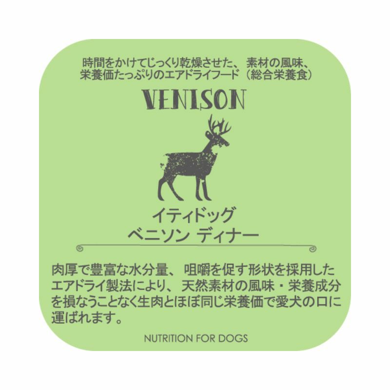 ベニソン、ベニソン内臓、ココナッツグリセリン、亜麻仁、緑イ貝、シーソルト、ベニソン骨、ミックストコフェロール(酸化防止剤)、アミノ酸類(タウリン)、ビタミン類(塩化コリン、E、B1、A、B3、B5、B2、B6、D、ビオチン、B12、葉酸)、ミネラル類(リン酸二カリウム、炭酸カルシウム、鉄、亜鉛、セレン、銅、マンガン、ヨウ素)