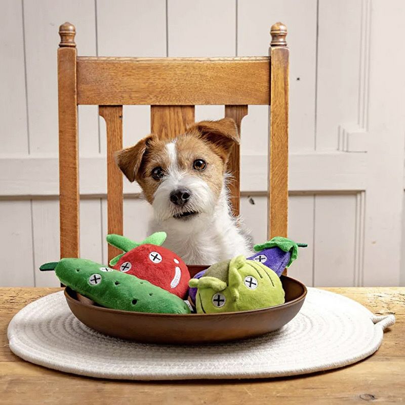 やさしい肌触りで小型犬に最適な、野菜モチーフのプラッシュトイ