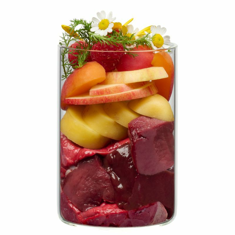 牛の心臓 (37%)、牛の肺 (12%)、じゃがいも (10%)、牛のレバー (6%)、リンゴ、キュウリ、レッドビート、トマト (3%)、アプリコット、ラズベリー (1%)、パースニップ*、ココナッツ粉、レープシードオイル、オイスターシェル、亜麻仁、ヤロー* (0.2%)、セージ*、カレンデュラ* (0.2%)、タイム*、カモミール* (0.2%)、ミネラルクレイ、ミネラル類 *乾燥