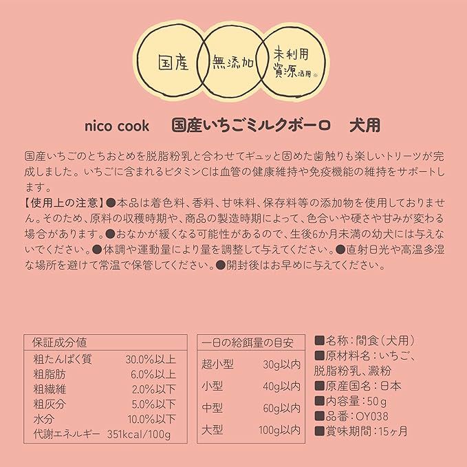 国産いちごと脱脂粉乳を合わせてギュッと固めた、こだわりの自然派トリーツです。