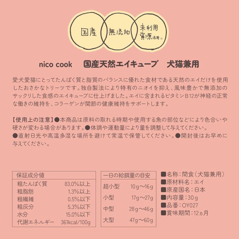 独自製法によりエイ特有のニオイを抑え、風味豊かなキューブ状のおやつに仕上げました。
