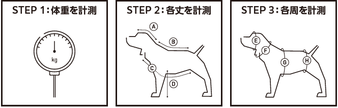 犬種ごとのサイズ目安と参考体重は以下よりご確認ください。あくまで目安となりますので、必ずサイズを計測の上ご購入ください。